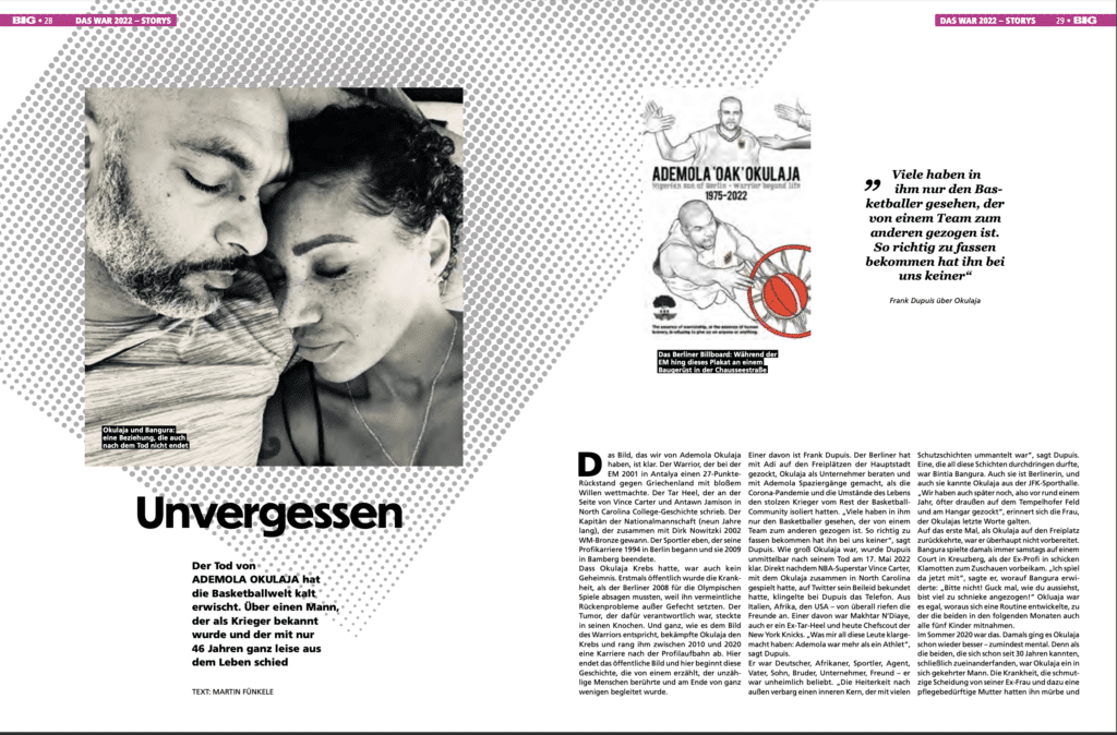 Einer davon ist Franck Dupuis. Der Berliner hat mit Adi auf den Freiplätzen der Hauptstadt gezockt, Okulaja als Unternehmer beraten und mit Ademola Spaziergänge gemacht, als die Corona-Pandemie und die Umstände des Lebens den stolzen Krieger vom Rest der Basketball-Community isoliert hatten. „Viele haben in ihm nur den Basketballer gesehen, der von einem Team zum anderen gezogen ist. So richtig zu fassen bekommen hat ihn bei uns keiner“, sagt Dupuis. Wie groß Okulaja war, wurde Dupuis unmittelbar nach seinem Tod am 17. Mai 2022 klar. Direkt nachdem NBA-Superstar Vince Carter, mit dem Okulaja zusammen in North Carolina gespielt hatte, auf Twitter sein Beileid bekundet hatte, klingelte bei Dupuis das Telefon. Aus Italien, Afrika, den USA – von überall riefen die Freunde an. Einer davon war Makhtar N’Diaye, auch er ein Ex-Tar-Heel und heute Chefscout der New York Knicks. „Was mir all diese Leute klargemacht haben: Ademola war mehr als ein Athlet“, sagt Dupuis.